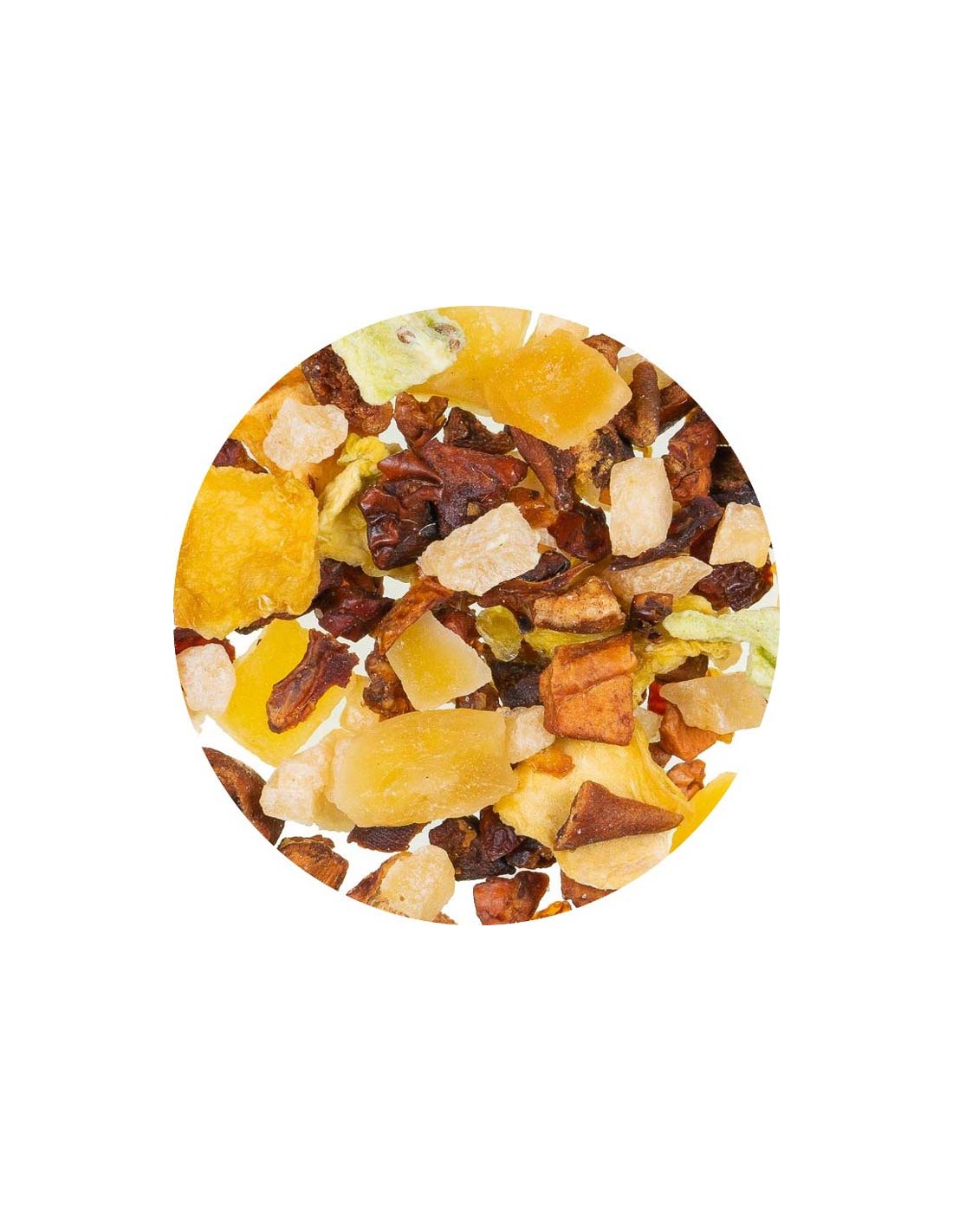 Al gusto di mango. Ingredienti: mela (mela, acidificante: acido citrico), mango candito (mango, zucchero) (12%), mango (8%), aromi naturali, curcuma, fiori di cartamo.
