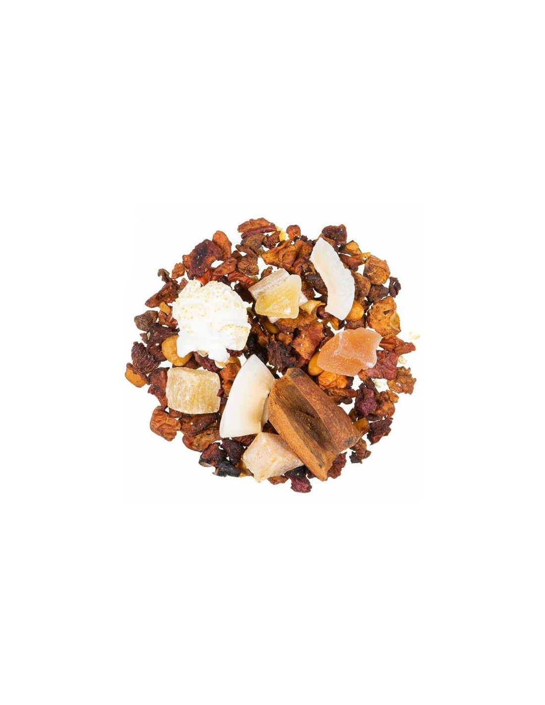 Al gusto di Pan di zenzero. Ingredienti: mela (mela, acidificante: acido citrico), ananas candito (ananas, zucchero), papaya candita (papaya, zucchero), barbabietole, bastoncini di cannella, aromi, uvetta, scaglie di cocco (cocco, zucchero), mandorle tostate (mandorle, zucchero caramellato) (2%), popcorn (mais, olio di colza). Senza ibisco.