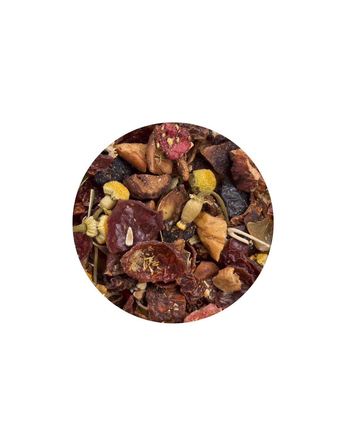 Al gusto di Aronia e Vaniglia. Mela, rosa canina, fiori di tiglio, camomilla, Aronia nera, barbabietola rossa, fiori di sambuco, aromi.