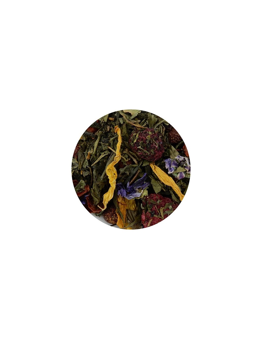 Al gusto di lamponi e menta. Ingredienti: Tè verde Sencha, rosa canina, menta piperita (min 5,1%.), aromi, lamponi (min 3,3%.), fiori di girasole, malva.
